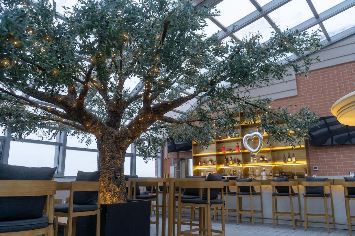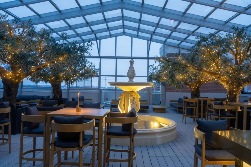 The enclosure allows the rooftop to operate comfortably in all seasons, maintaining the open-air feel during warm months and providing protection during winter.